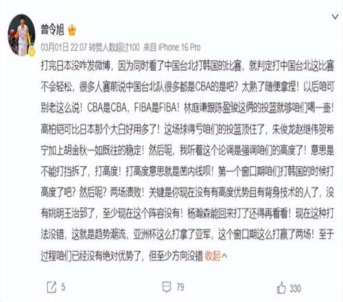 北京時間3月1日,中國男籃100-93擊敗中國臺北男籃拿到二連勝,這世預賽第二個窗口期全勝為男籃晉級第二階段奠定了基礎,七月份再贏一場就可以鎖定前三的席位。全新的陣容讓男籃收獲頗豐,我認為一大收獲就是賀希寧。