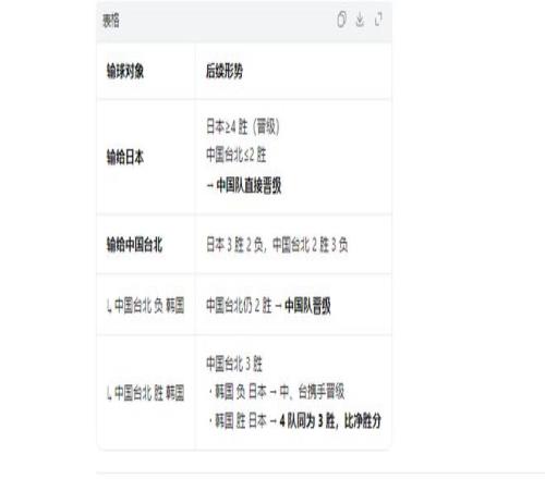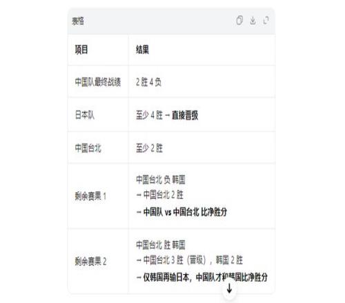 此時就看韓國隊臉色,若韓國隊最后一輪輸日本,他們最終成績就是2勝4負,中國隊和中國臺北隊攜手晉級;若贏,四隊同為3勝3負,比拼凈勝分定晉級。