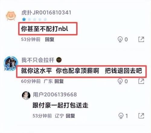 在全隊12人登場,10人正負值達到兩位數的情況下,范子銘作為北京隊內僅有的3名頂薪球員,正負值卻差點為負值,屬實讓人難以置信。也難怪,賽后有球迷吐槽:“你甚至不配打NBL”、“就你這水平,你也配拿頂薪,把錢退回去吧”、“能被楊文學連續單吃兩次的應該不多了”......