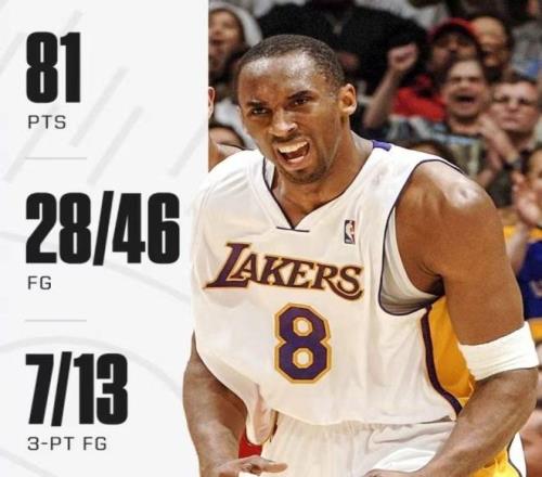 科比那場比賽是全場46投28中,三分13投7中,罰球20罰18中,得到81分6籃板2助攻,整個下半場拿到55分,命中率60.8%,三分命中率53.8%,科比的命中率、三分命中率都比阿德巴約更高,而且科比是在下半場帶隊逆轉。