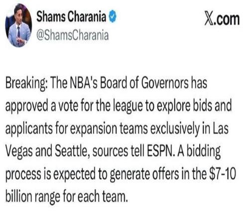 至于新加盟的球隊,其單隊加盟費預計需要70–100億美元,新球隊有望在2028–29賽季正式參賽。