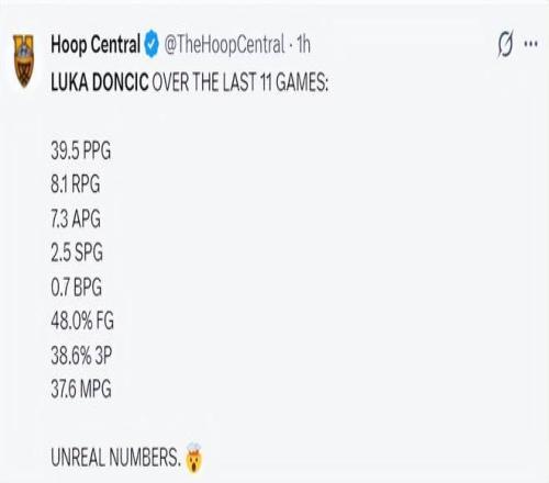 過去的11場比賽東契奇場均37.6分鐘,拿到39.5分8.1籃板7.3助攻2.5搶斷0.7蓋帽,命中率48%,三分命中率38.6%。