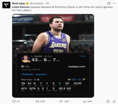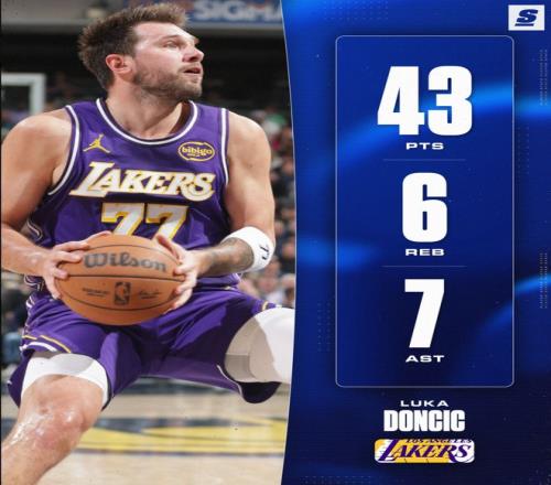 湖人在對陣步行者一戰中,盧卡-東契奇再度斬獲43+7+6的數據,全場比賽37分鐘,30中15,三分11中4,罰球10中9,拿到43分7助攻6籃板1搶斷,命中率50%,美中不足是有5個失誤,此役東契奇又一戰創造多項紀錄。