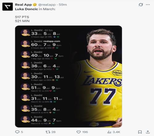 整個三月份東契奇出戰了521分鐘拿到517分,這個得分效率實在是太過于驚人了,目前東契奇場均33.6分也是聯盟的得分王。