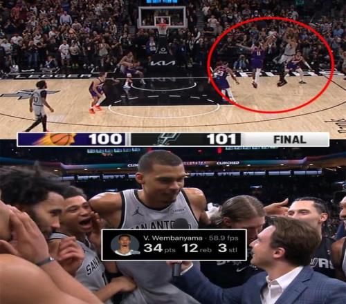 其中對陣太陽的比賽,最后時刻馬刺落后1秒,文班亞馬還讀秒完成了一記“杜蘭特式”的后仰中投絕殺。