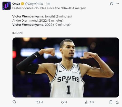 3.文班亞馬更是不足20分鐘砍下30+10,打破了揚尼斯的紀錄。