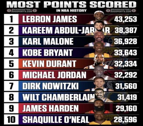 說很多人爭論“歷史第一得分手”時,總喜歡拿場均得分和總得分互相抬杠??磮鼍瑔痰な巧?看總分,詹姆斯是王。...