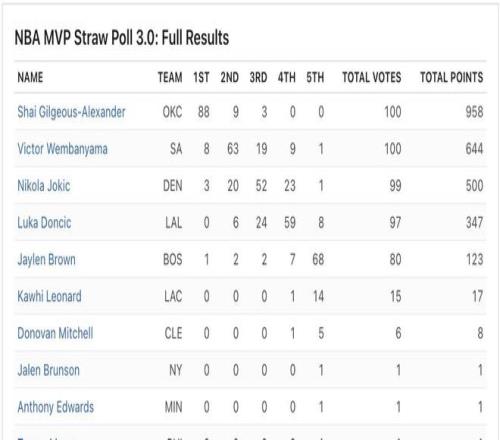 據(jù)ESPN最新一期MVP模擬投票統(tǒng)計,亞歷山大狂攬88張第一順位選票,總得分高達958分,以斷層優(yōu)勢領(lǐng)跑全聯(lián)盟。