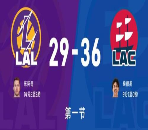 比賽開始湖人率先進攻,鄧恩對位東契奇,小卡對位詹姆斯,艾頓對位祖巴茨,哈登防守斯瑪特!拉拉維亞一上來就投中三分,快船進攻湖人這邊斯瑪特防守哈登,拉拉維亞對位小卡,詹姆斯防柯林斯,柯林斯反擊上籃拉拉維亞三分再中,祖巴茨內線拋投4-6開局。斯瑪特三分三不沾,祖巴茨內線拋投不中東契奇轉換拋投來一個,小卡突然爆發連得8分快船反超,斯瑪特籃下吃餅比分12平!哈登上籃被帽詹姆斯轉換傳球失誤,中段雙方依舊維持對攻態勢,誰也無法甩開誰。哈登突破東契奇下手犯規,6分17秒官方暫停?;氐奖荣惡颂魬鸪晒Γ材匪箾_擊內線祖巴茨犯規兩罰全中18-14領先4分,祖巴茨補籃桑德斯三分快船一波5-0反超1分,東契奇拋投止血,桑德斯三分再中一球,祖巴茨內線補籃得分快船反超4分,哈登盤活全隊湖人這邊只有東契奇單打,首節36-29快船領先7分!
