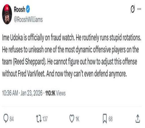 火箭媒體人Will更是發文直接點名烏度卡,表示自己真得需要烏度卡解釋一下,為什么謝潑德登場機會這么少,而且每一次都是在其狀態火熱時發生,火箭隊本賽季差不多有8-10場被逆轉的比賽是從謝潑德使用出問題開始的。