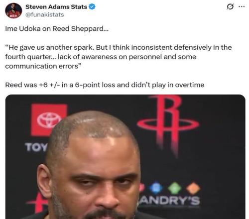 結果在這種情況下,烏度卡在加時賽中沒有使用謝潑德,而是繼續選擇信任申京與小賈巴里史密。