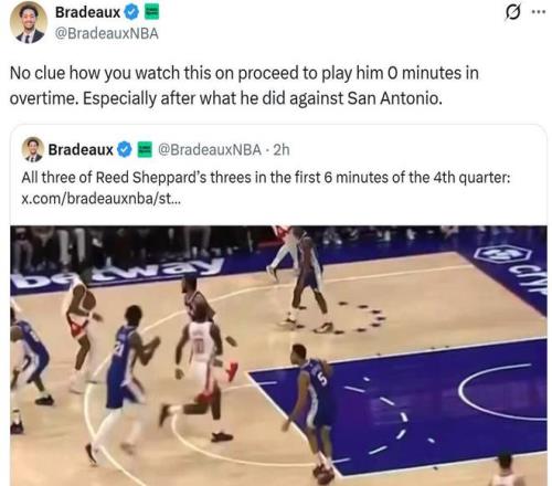 其中Bradeaux連發數條消息,先是稱贊了謝潑德的表現,然后對謝潑德末節遭遇DNP感到不可思議:“我完全不明白你們(火箭教練組)在搞些什么東西,加時賽居然一分鐘都不讓謝潑德打,尤其是上一場對陣馬刺他交出如此火爆表現之后?!?/p>