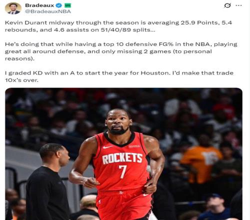 對(duì)陣費(fèi)城的賽前火箭記者寫道:杜蘭特本賽季場(chǎng)均得到 25.9 分、5.4 個(gè)籃板和 4.6 次助攻,投籃命中率 51%,三分球命中率 40%,罰球命中率 89%,他限制對(duì)手命中率聯(lián)盟前十,防守端非常全面,而且只因?yàn)閭€(gè)人原因缺席兩場(chǎng)比賽,我給杜蘭特交易到休斯頓打了A的評(píng)級(jí),如果有這樣的機(jī)會(huì)我會(huì)做10次這樣的交易。