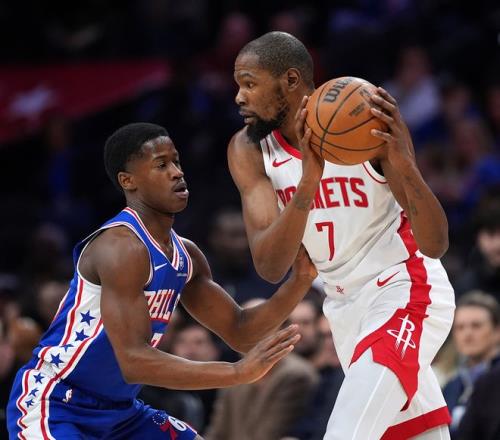 上半場(chǎng)杜蘭特的手感就好到不行,首節(jié)4中2拿到7分1助攻3籃板,次節(jié)更是3投3中拿到9分1助攻,半場(chǎng)杜蘭特7中5拿到16分,效率值相當(dāng)之恐怖,只可惜火箭隊(duì)還是落后費(fèi)城。