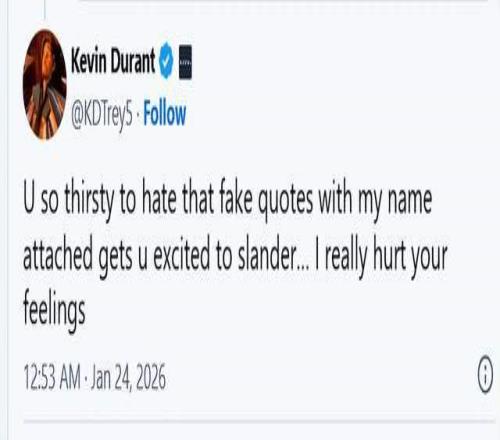 對此,杜蘭特本人在社媒上回應球迷:“你是真的相信這話是我說的,還是單純掉進了別人設的圈套?”