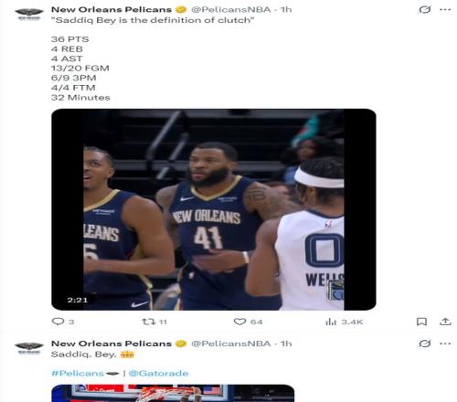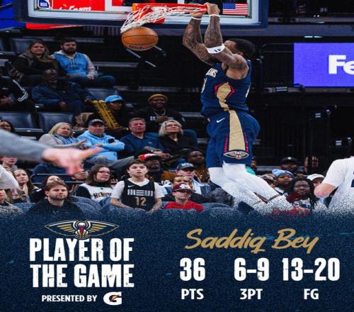 薩迪克-貝32分鐘,拿到36分4籃板4助攻1搶斷(末節19分);鵜鶘隊末節打出40-26的浪潮多虧了薩迪克-貝。