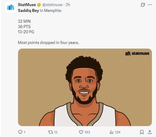 薩迪克-貝這36分是鵜鶘生涯新高,6個三分球也是鵜鶘生涯新高,末節19分也是鵜鶘生涯新高。