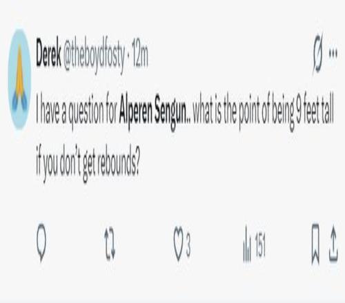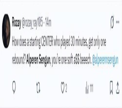 北京時(shí)間1月24日,火箭以111-104復(fù)仇活塞。這場(chǎng)比賽火箭隊(duì)的先發(fā)中鋒阿爾佩倫-申京延續(xù)了他對(duì)陣費(fèi)城的低迷狀態(tài),此役他的拉胯更盛,火箭球迷們對(duì)他已經(jīng)忍無可忍在社媒上各種炮轟,全都是因?yàn)樯昃┳鳛橐幻?尺11(2.11米)的中鋒只有1個(gè)籃板。