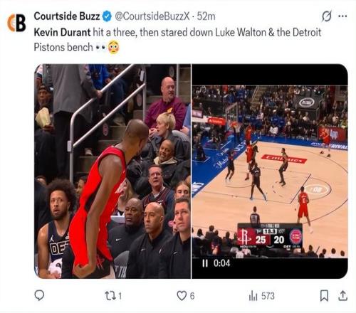 第一節杜蘭特命中幾乎壓哨的三分球后,杜蘭特怒視著活塞替補席與盧克-沃頓。