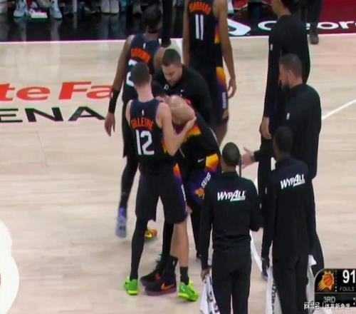 比賽進行到第三節,布克在快速跑動過程中,不慎踩到了奧孔武的腳,瞬間,他的腳踝遭受嚴重扭傷。從現場畫面來看,這個角度的腳踝扭傷,情況不容樂觀,顯然不是小傷。
