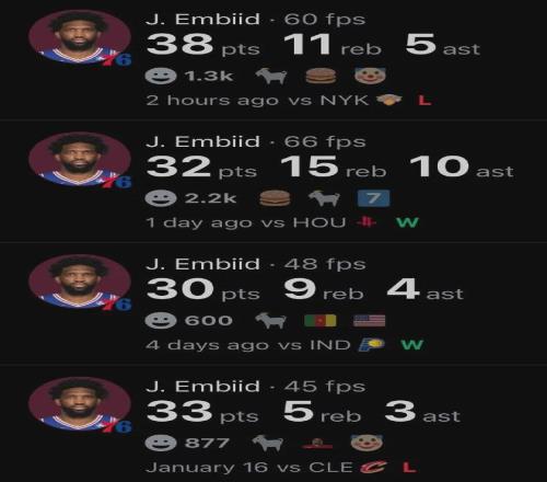 恩比德近期的狀態不可阻擋,已連續四場得分30+,分別轟下33分、30分、32分和38分,夢回自己的MVP(22-23賽季)時期。