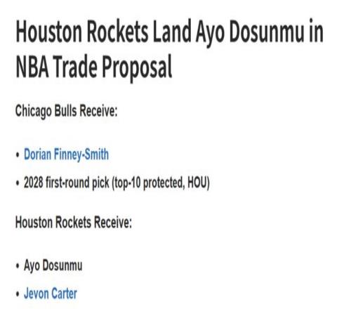 公牛得到:芬尼史密斯+28年火箭首輪簽(前十保護)。