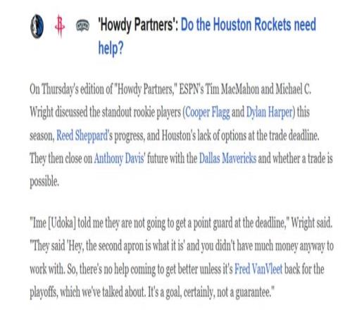 名記Chris Haynes、美媒《clutchpoints》名記Brett Siegel和美媒《cbssports》均表示,主教練的發聲實際上與總經理的想法未必完全一樣,火箭隊的確補強意愿不強烈,但如果合適的時機出現,斯通也會有所行動。