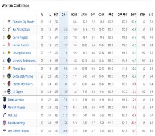 這個(gè)比賽日后,西部排名:雷霆、馬刺、掘金、火箭、湖人、森林狼、太陽、勇士、開拓者、快船、獨(dú)行俠、灰熊、爵士、國王、鵜鶘。