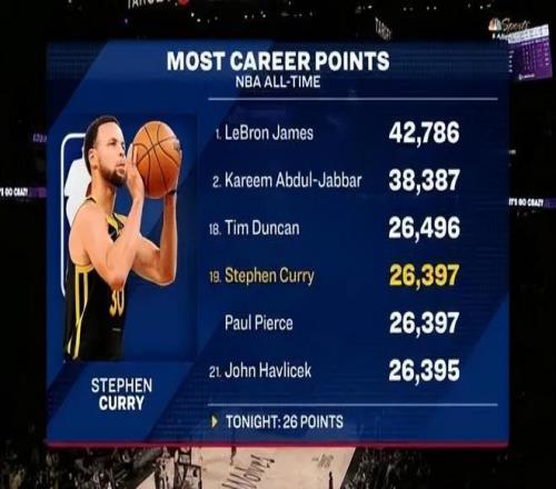 要算清楚他多久能進前十,得先定個目標基準?,F在NBA歷史得分榜第十位是奧尼爾,生涯總得分定格在28596分。庫里現在26397分,跟奧尼爾的差距是2199分。單看這個數字可能沒概念,咱們用他本賽季的效率算一算:場均27.3分的話,理論上還需要81場比賽才能超越。