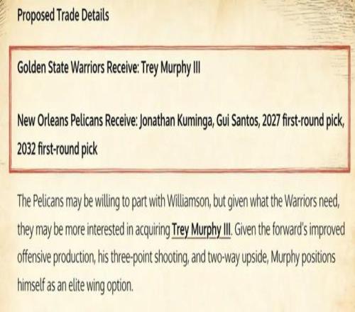 那么勇士有什么辦法能夠得到墨菲呢?美媒《Fadeaway World》提出了一套4換1的交易方案,建議勇士將庫明加、桑托斯以及2027年、2032年的首輪簽打包送到鵜鶘,換回墨菲。