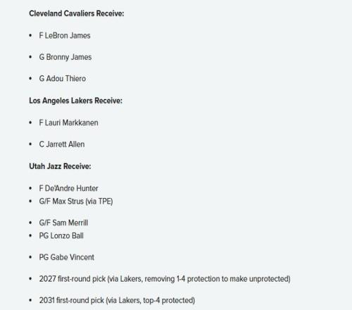 爵士得到:亨特、斯特魯斯、梅里爾、朗佐-鮑爾、文森特、湖人2027年首輪簽(移除前四順位保護,變為無保護簽)、湖人2031年首輪簽(前四順位保護)