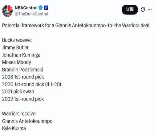 勇士已聯系雄鹿,愿意送出除庫里外所有資產。無論字母哥傷勢如何以及回歸時間表是否明確,這一意向都不會改變。雄鹿隊記Nehm列出了雙方8換2交易的潛在框架。勇士送出巴特勒、庫明加、穆迪、波杰姆斯基、2028年首輪選秀權、2030年首輪選秀權(如果順位在1-20)、2032年首輪選秀權、2031年選秀權互換資格,從雄鹿換來字母哥和庫茲馬。