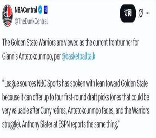 北京時間1月30日,據NBC體育報道,消息人士透露,金州勇士隊處于字母哥爭奪戰的領跑位置,因為他們最多能拿出四個首...
