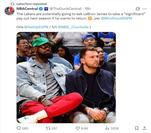 1月30日凌晨,ESPN記者布萊恩-文霍斯特透露,在今夏湖人會要求勒布朗-詹姆斯降薪,而且是大幅度的降薪,只要詹姆斯還想在湖人繼續征戰他就不得不接受這種程度的降薪。