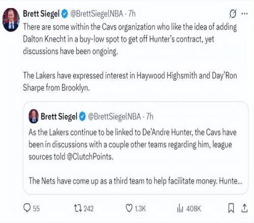 在Brett Siegel的報道中,湖人隊有意在交易截止日得到的球員還不止亨特一人,籃網隊的海史密斯、夏普也是意中人。