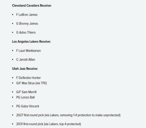 爵士得到:亨特、斯特魯斯、梅里爾、鮑爾、文森特、湖人2027年首輪簽、湖人2031年首輪簽