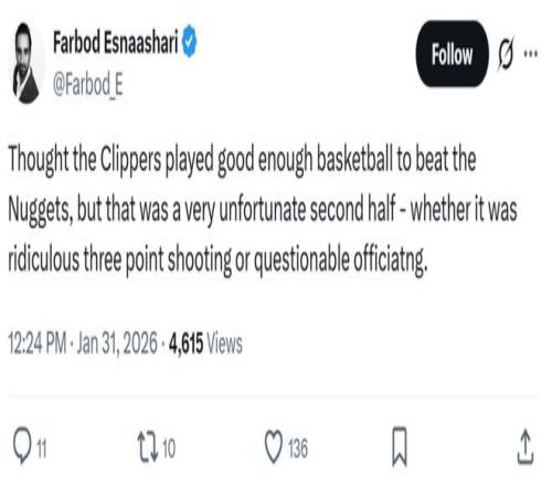 正如賽后快船記者Farbod Esnaashari所說:“盡管快船本場比賽的表現(xiàn)足以擊敗掘金,但下半場的狀況的確艱難,不僅要面對離譜的三分投射效率,還要應(yīng)對頗具爭議的吹罰尺度。”