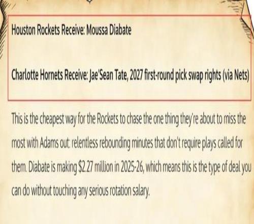 在球隊管理層遲遲沒有動靜的情況下,一些媒體、球迷紛紛開始為他們出謀劃策。比如,美媒《Fadeaway World》便撰文建議,火箭可以將泰特以及2027年首輪簽的互換權(quán)(來自籃網(wǎng))送到黃蜂,換回迪亞巴特。