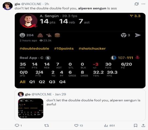 賽后火箭記者Bradeaux也為申京、杜蘭特辯護,這兩人本場比賽37中12手感不佳,但火箭還是贏球了,因為這兩人合力送出15次助攻,全隊33次助攻只有6次失誤。