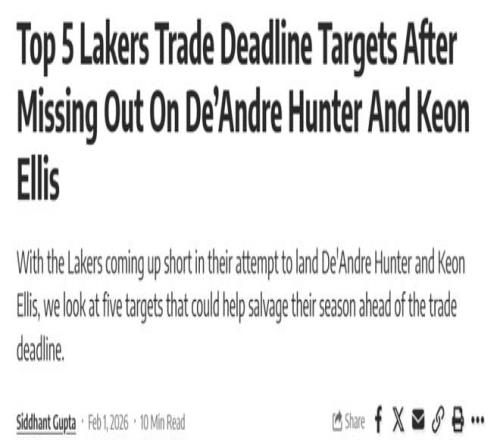 湖人兩大心上人亨特與埃利斯互換后,美媒《FW》再送紫金軍團(tuán)5大交易補(bǔ)強(qiáng)目標(biāo)!兩人完美滿足東契奇對(duì)于中鋒的補(bǔ)...