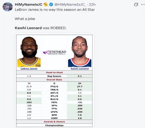 快船媒體曬出詹姆斯、倫納德的數據對比,倫納德還比詹姆斯多打4場比賽!
