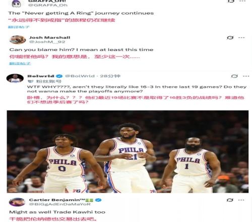 另外有網友說:“哈登一輩子拿不到總冠軍戒指,他的旅程還在繼續?!?、“如果交易他,那不如把萊昂納德也一起交易掉。”、“最近19場比賽,快船的戰績是16勝3負,他們難道不想打季后賽了嗎?”、“快船的狀態本來已經回來了,現在他們是聯盟里勢頭最火熱的球隊,哈登居然想走,背后是不是發生了什么我們不知道的內幕?”可以看到大部分的網友其實還是不懂,為什么在這個時間點,哈登會和快船商量著走人。