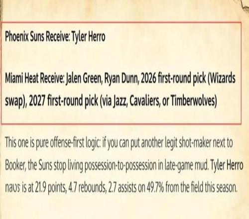 美媒《Fadeaway World》撰文建議,太陽隊可以將格林、鄧恩、2026年及2027年的首輪簽送到熱火,換回希羅。
