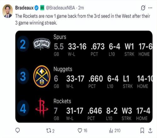 這一波三連勝后,火箭31勝17負,勝率64.6%,火箭隊距離西部第三的掘金只差1個勝場,火箭隊又有希望去染指西部前三了。