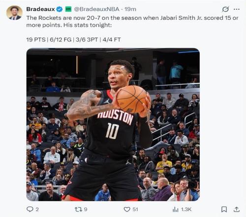 火記曬出小賈此役12中6+三分6中3拿到19分的數據,他寫道:當本賽季小賈至少能拿到15分時火箭隊戰績20勝7負,看起來小賈也是火箭勝負晴雨表。