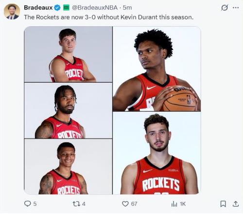 賽后火箭記者Bradeaux寫道,本賽季杜蘭特缺席的三場比賽火箭隊3勝0負,從這個層面來看火箭與杜蘭特是相互成就,火箭隊根本不是專業啃老的年輕球隊。