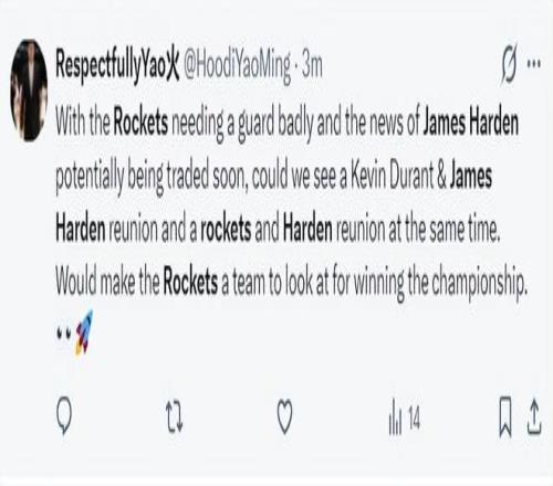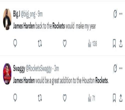 哈登可能重返休斯頓的消息出爐后,火箭球迷們紛紛發聲:火箭急需一名控球后衛,哈登即將被交易的消息傳出,我們有機會看到杜蘭特、哈登第三次攜手,如果這兩人在休斯頓重聚,我們有希望拿到總冠軍。
