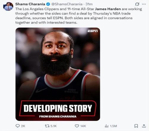 賽季至今哈登出戰44場比賽,場均35.4分鐘,拿到25.4分4.8籃板8.1助攻1.3搶斷,命中率41.9%,哈登托底能力有目共睹,根據Shams所說哈登也有意在交易截止日離開快船,現在是快船、哈登雙方都在努力將他送到一支更具競爭力的球隊。