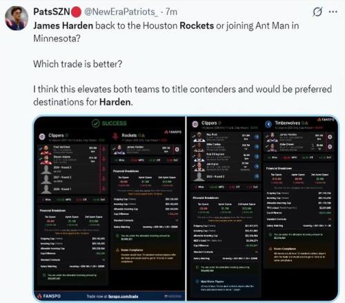 美媒PSAN模擬了一套火箭交易得到哈登的方案,那就是火箭送出范弗利特、亞當斯、2028年首輪簽、2026年黃蜂次輪、2027年灰熊次輪得到哈登,也就是5換的1方案。哈登本賽季薪水3918萬,范喬丹+海王剛好配平。