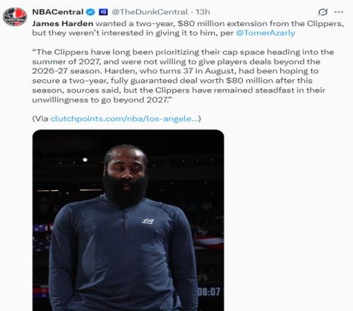 根據(jù)快船記者Tomer Azarly的報道,哈登原本希望給快船簽下一份兩年8000萬的完全保障合同,但快船不愿意答應他的請求,快船隊一直將球隊2027年夏天的薪資空間座位工作重點,不愿意給球員超過26-27賽季的合同。